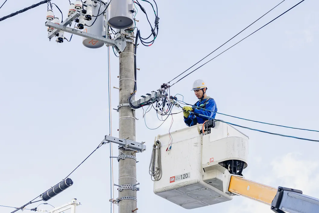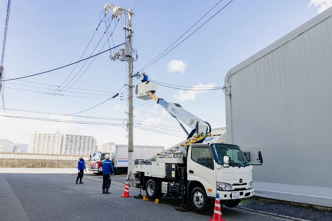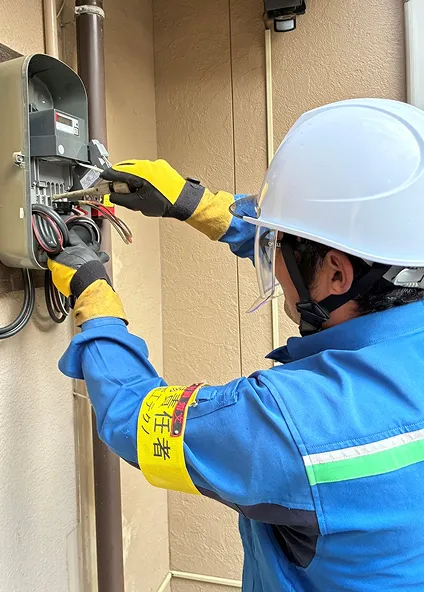 地域の暮らしと産業を支えるため、電力供給ルートの新設や老朽設備の改修・更新、災害時の迅速な復旧、建物への安全な引込線工事、絶縁保護具の耐電圧試験、電気メーターの定期交換、そして電柱の設置など、多様な工事を一貫して実施しています。