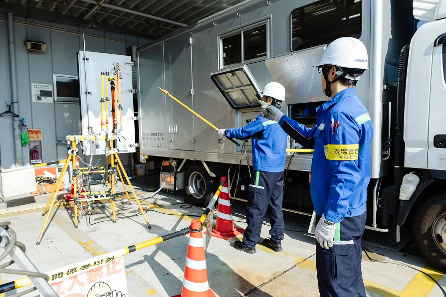 耐電圧試験専用車両を配備し、法令に基づき定期自主点検が義務付けられている絶縁保護具・防具などに対して、安全を守るために耐電圧試験を実施しています。